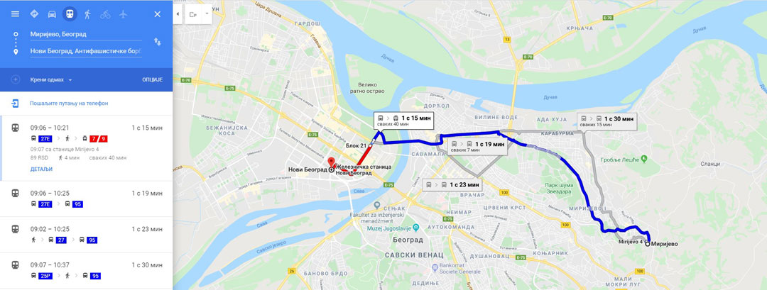 Грађанима Србије и свим корисницима јавног превоза града Београда доступни су на Гугл мапи подаци о свим градским линијама, реду вожње, локацијама стајалишта, трасама и ценама карата у јавном саобраћају.