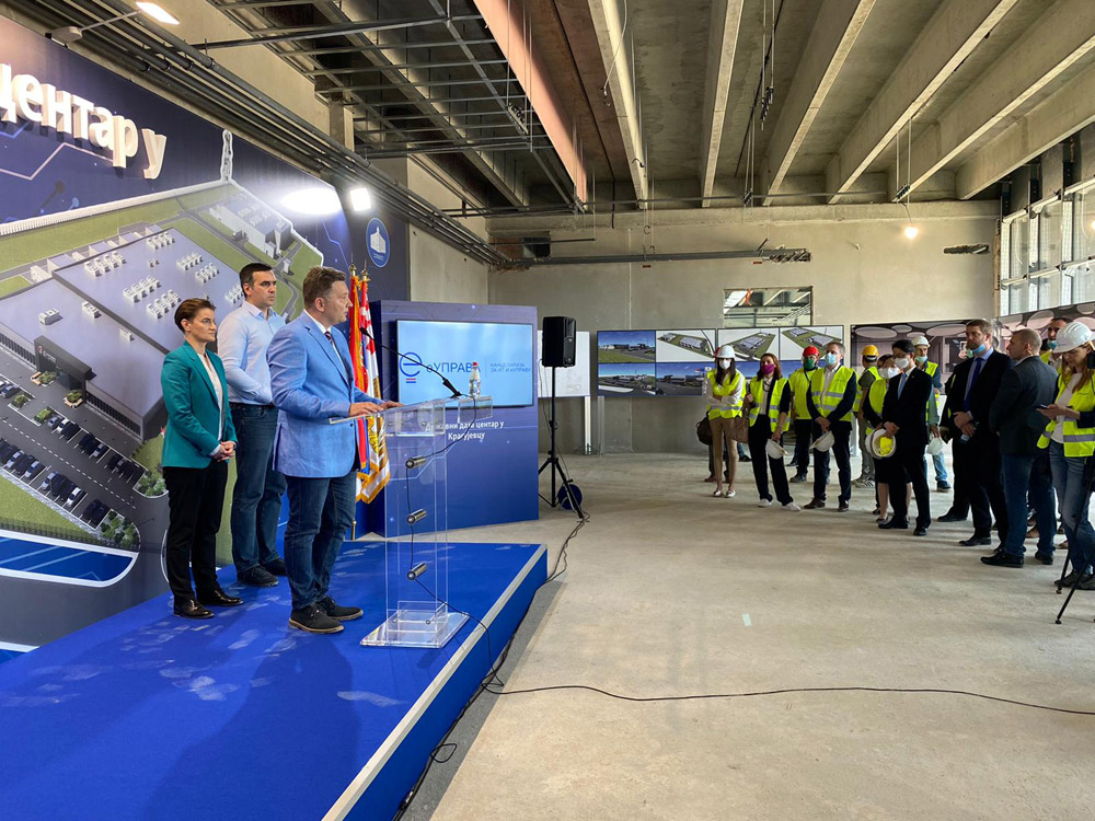 Председница Владе Србије Ана Брнабић обишла је данас са директором Канцеларије за ИТ и еУправу доц. др Михаилом Јовановићем и градоначелником Крагујевца Радомиром Николићем градилиште Државног дата центра у Крагујевцу. Изградња овог кључног објекта за даљи развој еУправе се одвија у складу са планираном динамиком и у наредним месецима се очекује његово отварање за кориснике из државне управе и локалне самоуправе, али и за комерцијалне кориснике.