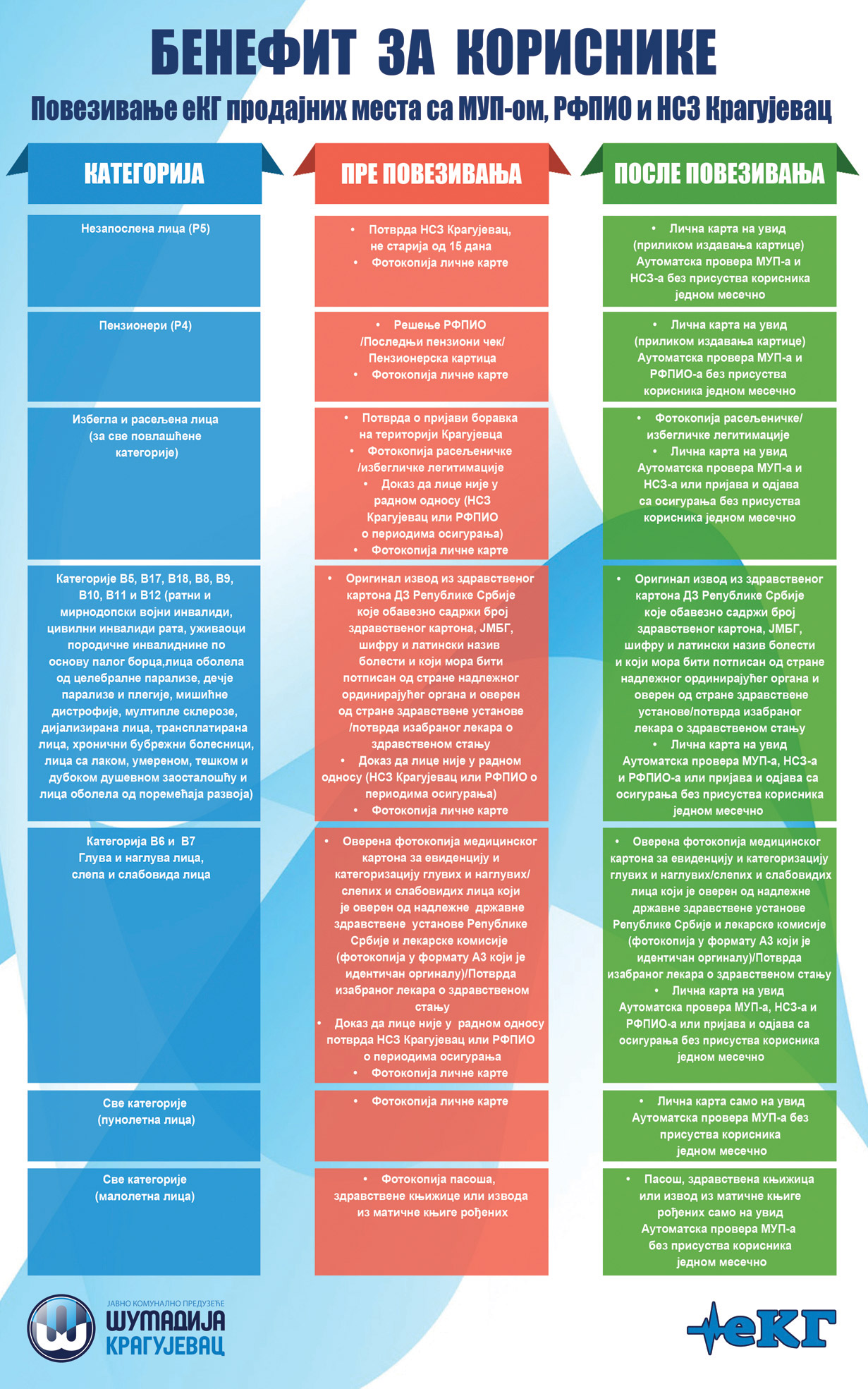 Захваљујући електронском повезивању Сектора јавног транспорта путника у ЈКП ”Шумадија” Крагујевац са системом еУправе - базама података Националне службе за запошљавање, ПИО фонда, Министарства унутрашњих послова и Централног регистра обавезног социјалног осигурања, пензионери и незапослена лица више неће морати да доносе папирне потврде и уверења приликом вађења или продужавања еКГ картица за превоз.