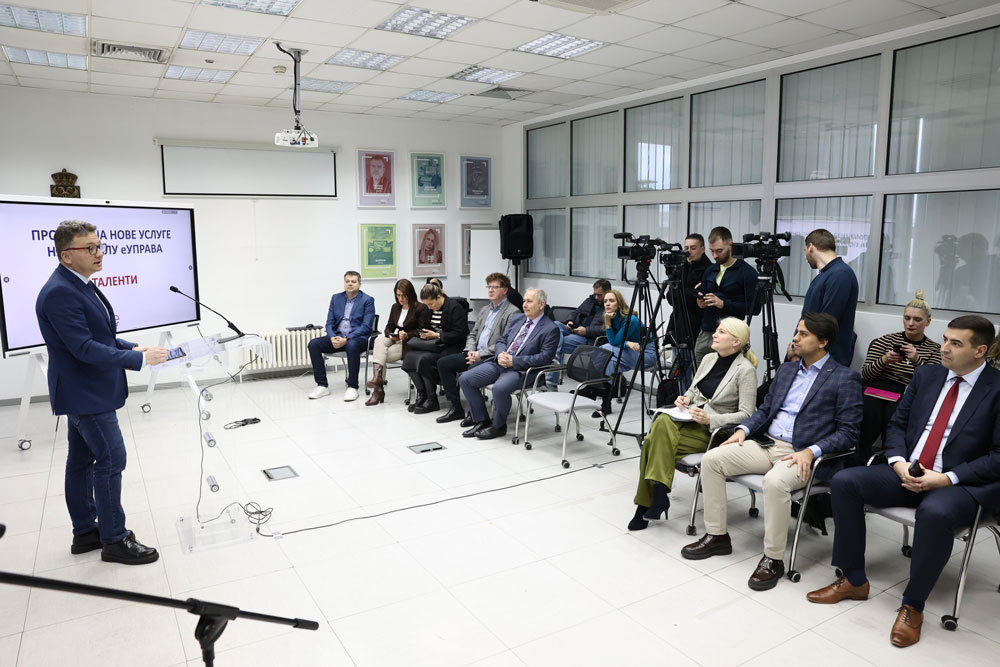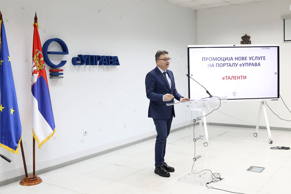 Министар информисања и телекомуникација Михаило Јовановић, министарка науке, технолошког развоја и иновација Јелена Беговић и в. д. директора Канцеларије за ИТ и еУправу Милан Латиновић присуствовали су данас представљању нове услуге на Порталу еУправа – еТаленти. Услуга, коју су заједно израдили тимови Канцеларије за ИТ и еУправу и Фонда за младе таленте, омогућиће електронску пријаву на конкурс Фонда за младе таленте за стипендирање студената завршних година на факултетима у Републици Србији.